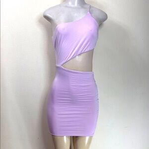 (T2) Princess Polly Mia Asymmetrical Stretch Mini Dress with Slits, Lilac - Size 6, Used in Perfect Condition. See photo for more details. Turn heads on your night out with this stunning bodycon dress from Princess Polly. Featuring an asymmetrical one-shoulder neckline and a daring cutout, this sleeveless piece is crafted in a rich purple hue. The ruched detailing adds texture and elegance, making it perfect for cocktail events.