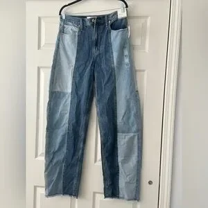 Unisex barrel jeans with blue patchwork design. Comfortable and stylish for everyday wear.