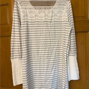 Chic long sleeve top with elegant floral embroidery on the sleeves. Features a classic striped pattern, perfect for any occasion. No tags, but would say a medium