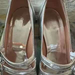 This sweet silhouette gets a cool update with double ankle straps, circular buckle details and an easy, walkable block heel. To top it off, they're crafted in shiny metallic leather that makes the perfect party statement. Heel is 3”. They fit more like a 7. Worn once. Excellent condition!!