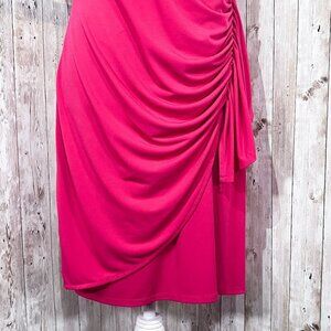 New York & Company sleeveless dress. Wrap style with gathered ruffle accent on left side. V-neck. Knee length. Size medium. Bright pink color. Good stretch to fabric. 95% polyester, 5% spandex.
