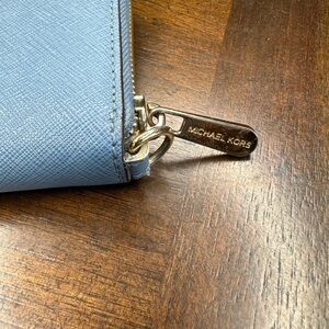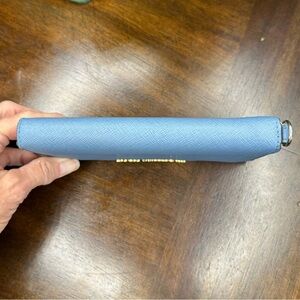 This distinctive Michael Kors wallet combines saffiano leather in blue with a motivational quote in bold gold, promoting individuality. The wallet has a gold zipper with minor stains and lacks the detachable wristlet strap. Inside, find a zippered coin pocket with minor marks and spotless slide pockets for cash and cards, showcasing a vibrant and stylish design.