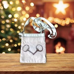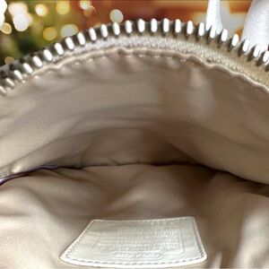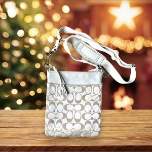 Coach cream jacquard signature and leather sling messenger crossbody handbag with painted horse bit, in near-excellent condition with minor strap discoloration that's barely noticeable. Features adjustable drop strap with 24" extension, snap attachment, zip-top enclosure, and two exterior slide pockets. Measures 8.75 x 7.5 × 0.5", ideal for daily use, boasting Coach insignia and hardware. No odors or stains, perfect for the equestrian enthusiast.