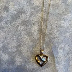 Charming heart necklace with a gold finish. Diamond accents add sparkle. Perfect for any occasion. 18 inch chain. 10k gold with 4 diamond accents and diamond baguettes. Like new - only worn a few times.