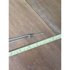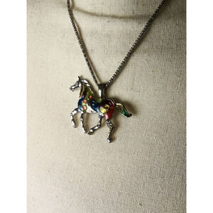 This is a pre-owned necklace featuring a horse pendant. The pendant is made of a silver-tone metal and is filled with colorful enamel details. The horse is in a running pose. The chain is a thin, silver-tone metal and measures approximately 12 inches in length. The pendant measures approximately 1.5 inches in height and 1.5 inches in width. There are no visible signs of wear or damage.