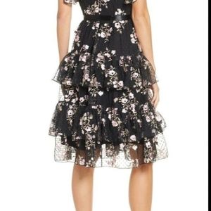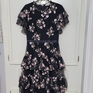 Elegant black dress with floral pattern. Features ruffled sleeves and tiered skirt. Perfect for prom or special occasions.