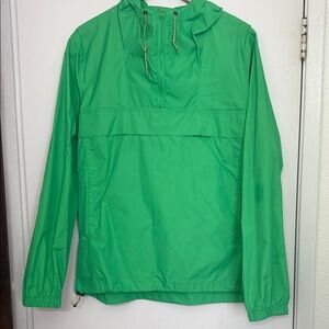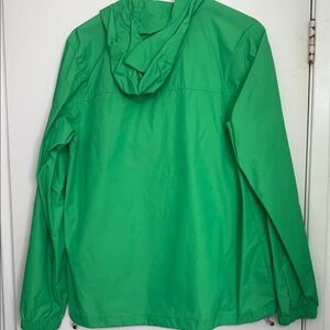Lightweight green windbreaker. Features a hood and front pocket. Perfect for outdoor activities.