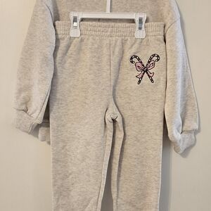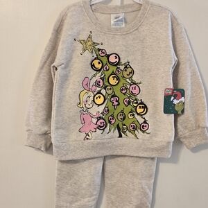 Charming kids Grinch sweatshirt and pants set with a holiday tree design. Ideal for festive occasions. In greysh/cream color