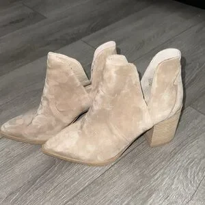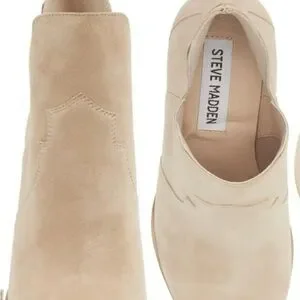 These Steve Madden booties in a sophisticated cream color feature a sleek pointed toe design and a minimalist style. They offer a comfortable fit and a versatile look suitable for various occasions. The light-colored sole complements the upper, adding to the shoe's elegant appeal.