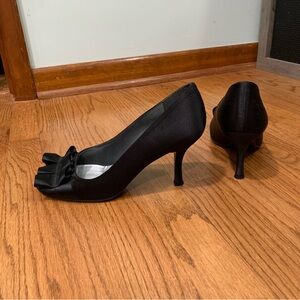 Stuart Weitzman Special Occasion Black Satin Ruffled Peep-Toe Heels