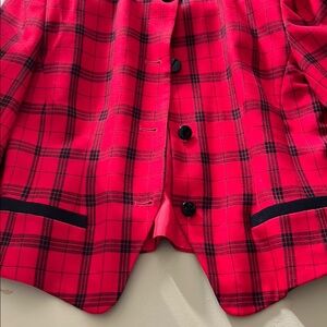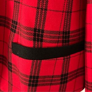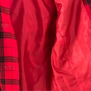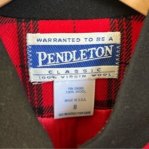 This Vintage Pendleton Jacket is a stylish and classic piece made in the USA from 100% virgin wool. This red and black blazer features a classic design with a classic look, perfect for the holiday season. With a chest size of 37” and a shoulder to shoulder measurement of 17”, this blazer is a size 8 and offers a timeless and sophisticated style for any woman. Made in the United States, this original Pendleton piece is a unique and high-quality addition to any wardrobe.