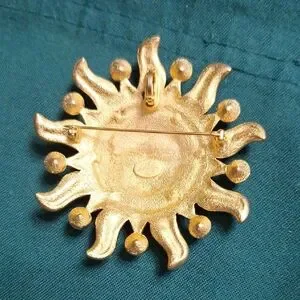 Radiant gold sunburst design. With words One Love surrounding the permiter. Features clear sparkling accents. Perfect for any outfit.