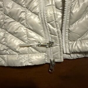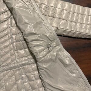 Women's The North Face TNF Thermoball Eco Silver Gray Parka Puffer Jacket. Double zipper pulls. Draw strings on the inside to tighten around waist. Outside pockets on both sides. Warm and lightweight. Size medium.