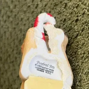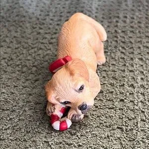 Charming tan puppy figurine with a red candy cane. Perfect for holiday decor.