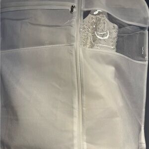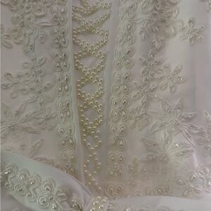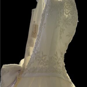 Beautiful sleeveless gown with intricate floral embroidery. Perfect for any bride on her special day. Missing 3 beads on bodice and the bow tack on one side appears to have come undone, so bow doesn’t sit flush horizontally. See pictures for defective spots. Comes with new, breathable garment bag with accessories pocket.