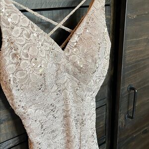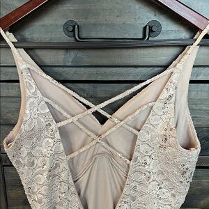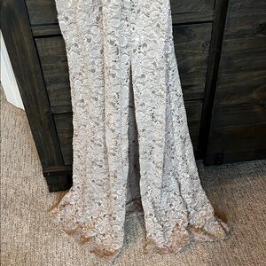 Step into elegance with this stunning lace evening gown. Perfect for any formal occasion, this dress features a beautiful cream color that exudes sophistication. The intricate lace design adds a touch of luxury, making it a must-have for your wardrobe.