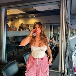 Elegant white corset top. Features lace trim and delicate straps. Perfect for chic styling.