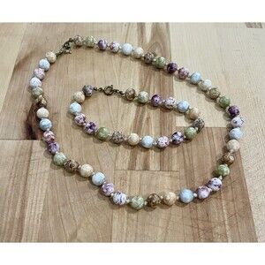 Vintage Multicolor Splatter Knotted Glass Bead Necklace Bracelet Set Art Deco