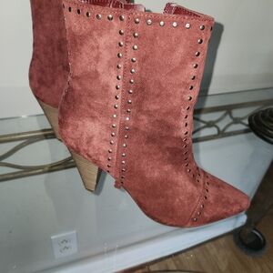 Chic rust suede boots with studded accents. Perfect for stylish outings. Comfortable block heel design.