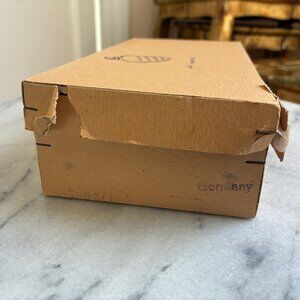 Box is not typical Shiny Brite. Box is actually stamped "Germany" on one side. I suspect someone put these lovely ornaments into this box and hand-decorated the box with the drawing on the lid and the written labels on each of the long sides.