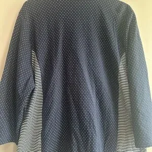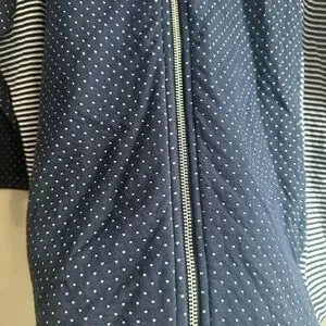 Stylish navy bomber jacket with polka dots. Features a zip front and striped accents. Perfect for casual outings.