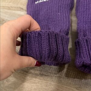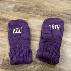 Cozy purple knit mittens with Minnesota logo. Right hand says “BOLD” and left says “NORTH”. From Super Bowl 52