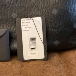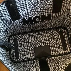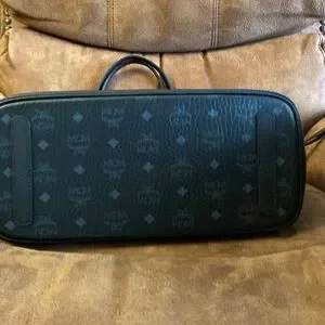 Elegant black tote. Features signature MCM logo pattern. Perfect for everyday use.