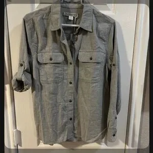Casual light gray shirt with button-up design. Features a classic collar and soft fabric. Gray lightweight and soft, sleeves can be rolled up like shown.