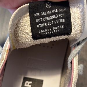 Elegant sneakers featuring a white base with pink accents. Iconic star design. Perfect for casual wear. On back of one of the shoes the metallic has come off. It is shown in the pictures.