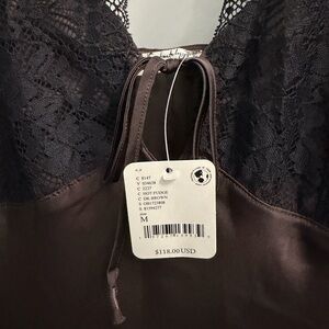 Adjustable shoulder straps, Tie keyhole at neckline , Thigh-high side slit at hem, Lace trim, Bias cut for slight stretch and elegant drape