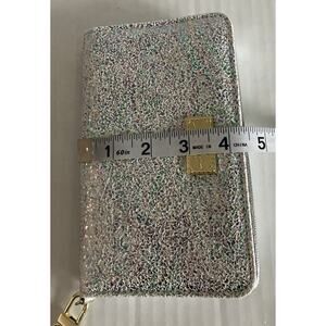 Women’s Betsey Johnson Wristlet Wallet “Luv Betsey” with removable strap. Iridescent silver with gold tone hardware, measuring 4.25” X 7”. Approximately 3.5” X 6.5” inside. Very good preowned condition, looks unused. Inside snap has minor scratches (last photo), otherwise perfect. Shipped USPS.