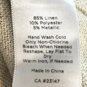 The sweater features lightweight fabric with metallic threading, short sleeves, a V-neck design, and is made from linen, polyester, and metallic materials.