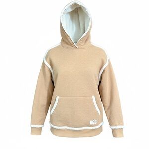 This is the UGG Joanne Bonded Fleece Hoodie in Heather Camel. It is a hooded sweatshirt made from a cotton blend, featuring a bonded fleece construction with exposed sherpa seams and a kangaroo pocket. The hoodie has an embroidered UGG logo on the front.