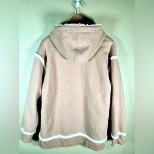 The hoodie is described as comfortable and cozy due to its sherpa lining. It is a pullover style with a relaxed, slightly oversized fit.