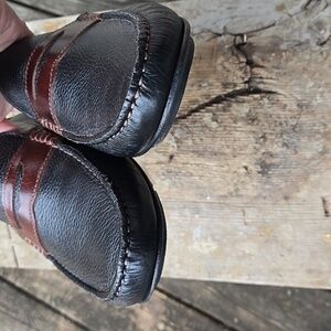 Black leather slip on loafers. Brown leather accents. Penny loafers.
