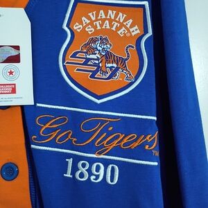 Stylish blue and orange cardigan featuring Savannah State University logo and 'Go Tigers' text.