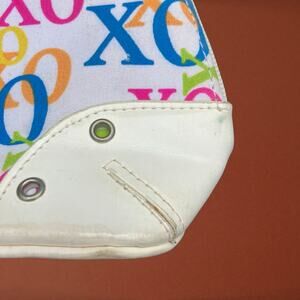 Y2K vintage XOXO white multicolor logo purse, 2000s, bratz, bling. Good condition pre owned, has some discoloration on straps and white corners. Measures 10" by 6.75". Handle drop length is 4.25". Bottom of bag is 3" wide.
