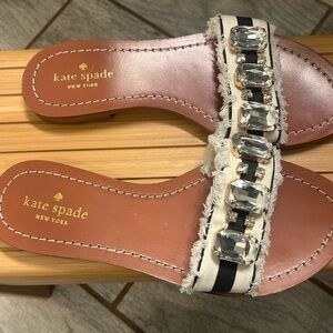 Step out in style with these chic Kate Spade sandals. Featuring a beige and black design with sparkling embellishments, these sandals are perfect for any occasion. The Kate Spade New York Women's Leather Slide-On Sandals in size 7 feature embellishments that give them a stylish and unique look. These black and cream sandals are perfect for casual occasions during the spring and summer seasons. Made with high-quality leather, they have a comfortable flat heel and a slip-on closure for easy wear. The iconic Kate Spade logo adds a touch of sophistication to these slide-style sandals, making them a versatile and chic addition to any woman's wardrobe.