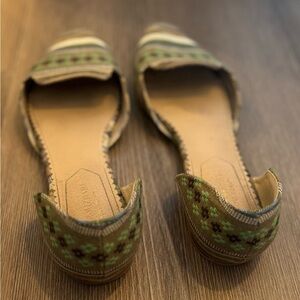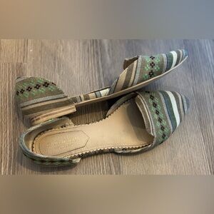 Beautiful Isaac Mizrahi flats with a blue/green floral pattern and multicolored stripes. Pointed toe. Womens size 8. Great condition.