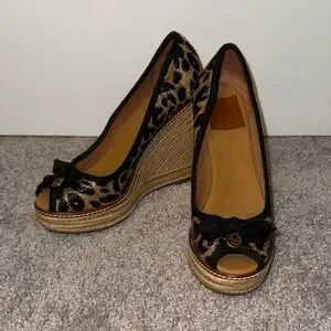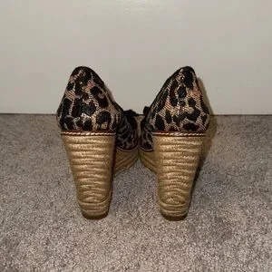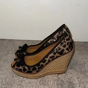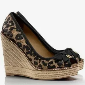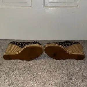 Stylish leopard print wedge espadrilles with a chic black bow. Perfect for adding a touch of elegance to any outfit.