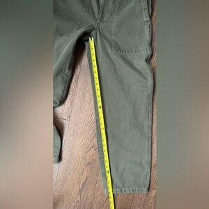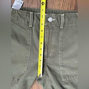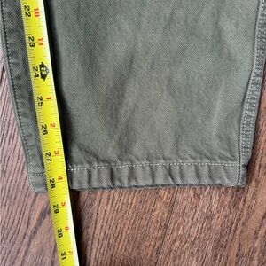 Levi’s Premium Denim Baggy Dad olive green jeans size 27. Baggy style with a tapered leg. Contrast stitching in off white. I do feel these run a bit big. 100% cotton, no stretch.