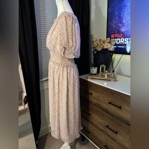 Stylish midi dress with a floral pattern. Features a smocked waist and short sleeves. Perfect for versatile wear.