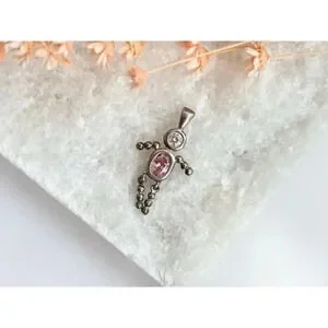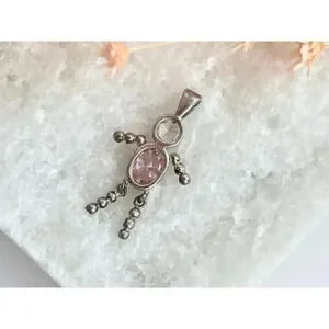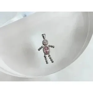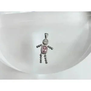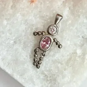 Tiny dainty sterling silver tourmaline + cz inlaid pendant. This piece has an oval center stone at the body of the little stick figure and a smaller circular stone as the head. This would look best with a silver toned chain. This is for the month of October as ther birthstone which is tourmaline. Wonderful gift idea! arms don't move, legs do move.