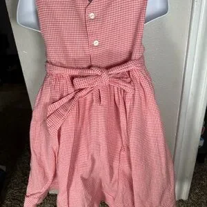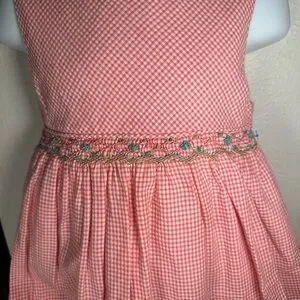 Charming pink checkered dress. Features a floral accent at the waist. Ideal for casual wear.