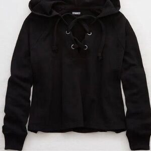 AERIE ~ Comfy Black Lace-Up Hooded Sweatshirt ~ Cropped Length ~ Size X-Small