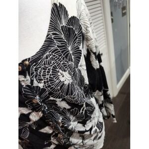 Keywords: White House Black Market cardigan, women's floral sweater, black and white cardigan, snap button front knit top, botanical print cardigan, designer knitwear, layering piece, elegant cardigan