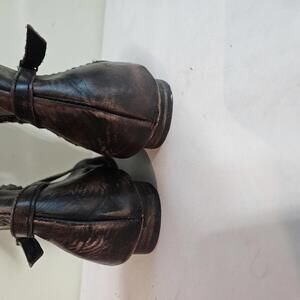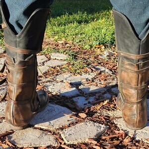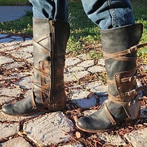 Keywords: Freebird boots, women's leather boots, Mid-calf high boots, strappy boots, casual streetwear boots, size 10 boots, black and brown boots.