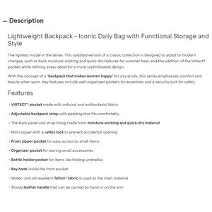 Really cute mini backpack. Lots of pockets and organization.