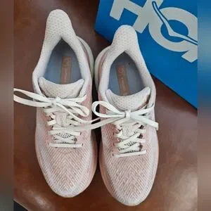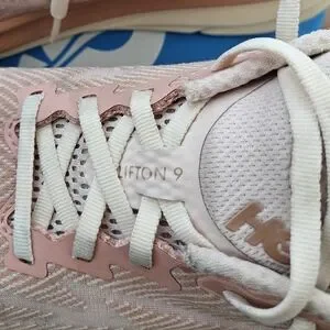 Hoka Clifton 9 women's size 7 lightly warn, indoor excersize only. shows little signs of wear. like-new condition. incredibly comfortable. incredibly lightweight. pinkish-salmon color. box included. smoke-free home. please see all pictures for wear. questions welcome. :)