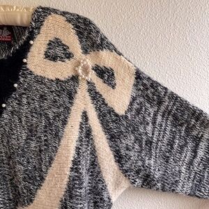 How to: look as pretty as a present! Vintage sweater features a crew neckline and long sleeves. Fabric is composed of a heather gray background with black and white details on the bodice. Black detail is covered in pearls. Trompe l'œil bow on the left shoulder with a large rhinestone in the center surrounded by pearls. Ribbed knit details on the cuffs and hemline. Medium weight. Label is Ginénne. About two inches of extra stretch. Fabric content is 68% nylon, 27% acrylic, 3% lambswool, and 2% Angora. Sweater is in excellent condition. Freshly cleaned and ready to wear!